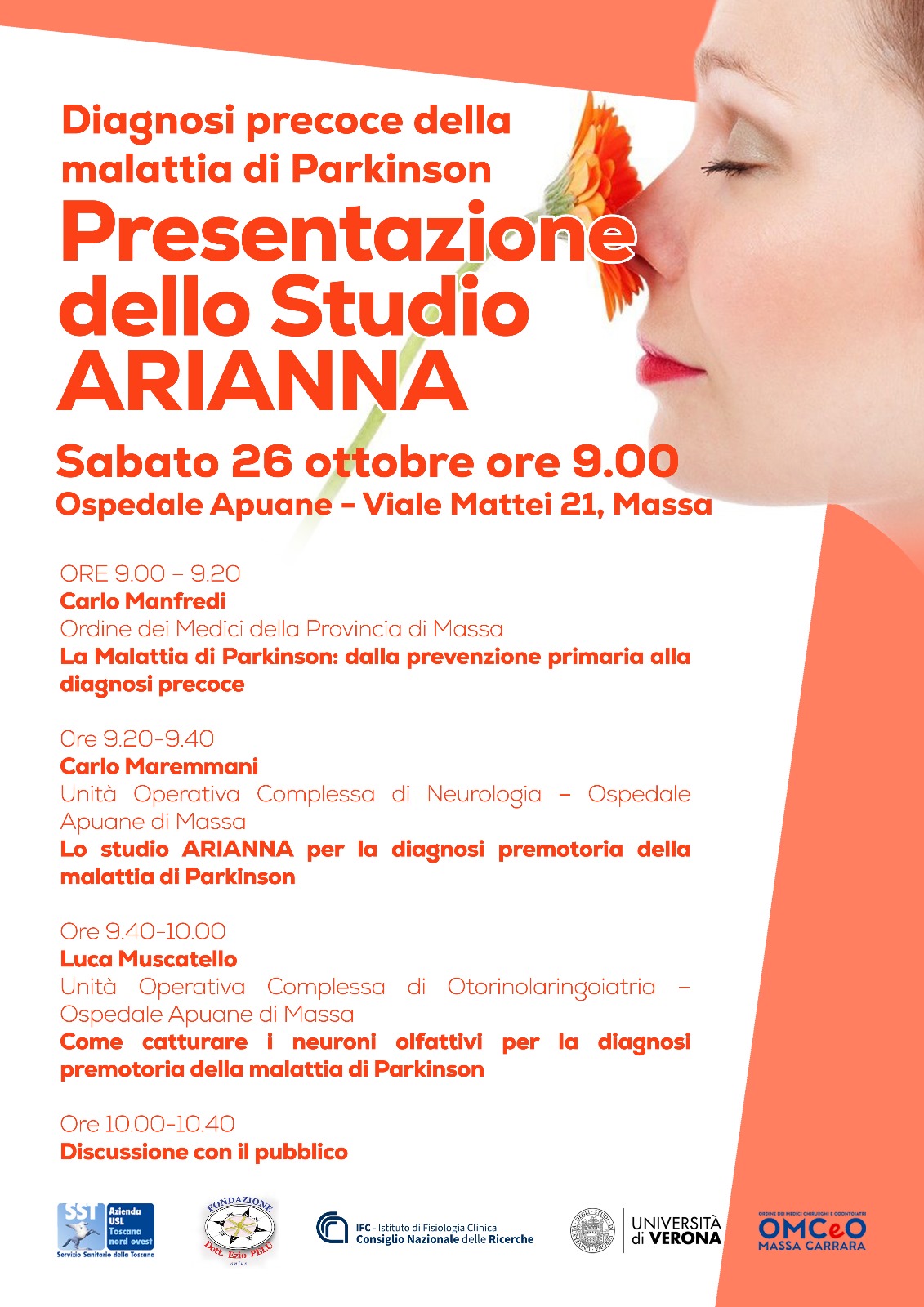 Pubblicato: 21 Ottobre 2024 News Diagnosi precoce della malattia di Parkinson Presentazione dello Studio ARIANNA Sabato 26 Ottobre ore 9:00Ospedale Apuane - Viale Mattei 21, Massa image Locandina 26 Ottobre(366 KB)