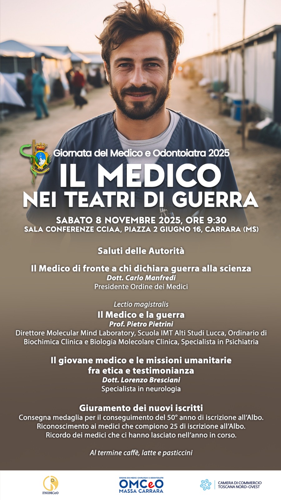 Pubblicato: 05 Novembre 2025 News Giornata del Medico e dell'Odontoiatra 2025 8 novembre 2025 Ore 9:30Sala Convegni Camera di Commercio, Carrara ALLEGATO: pdf PROGRAMMA GM 2025(144 KB)